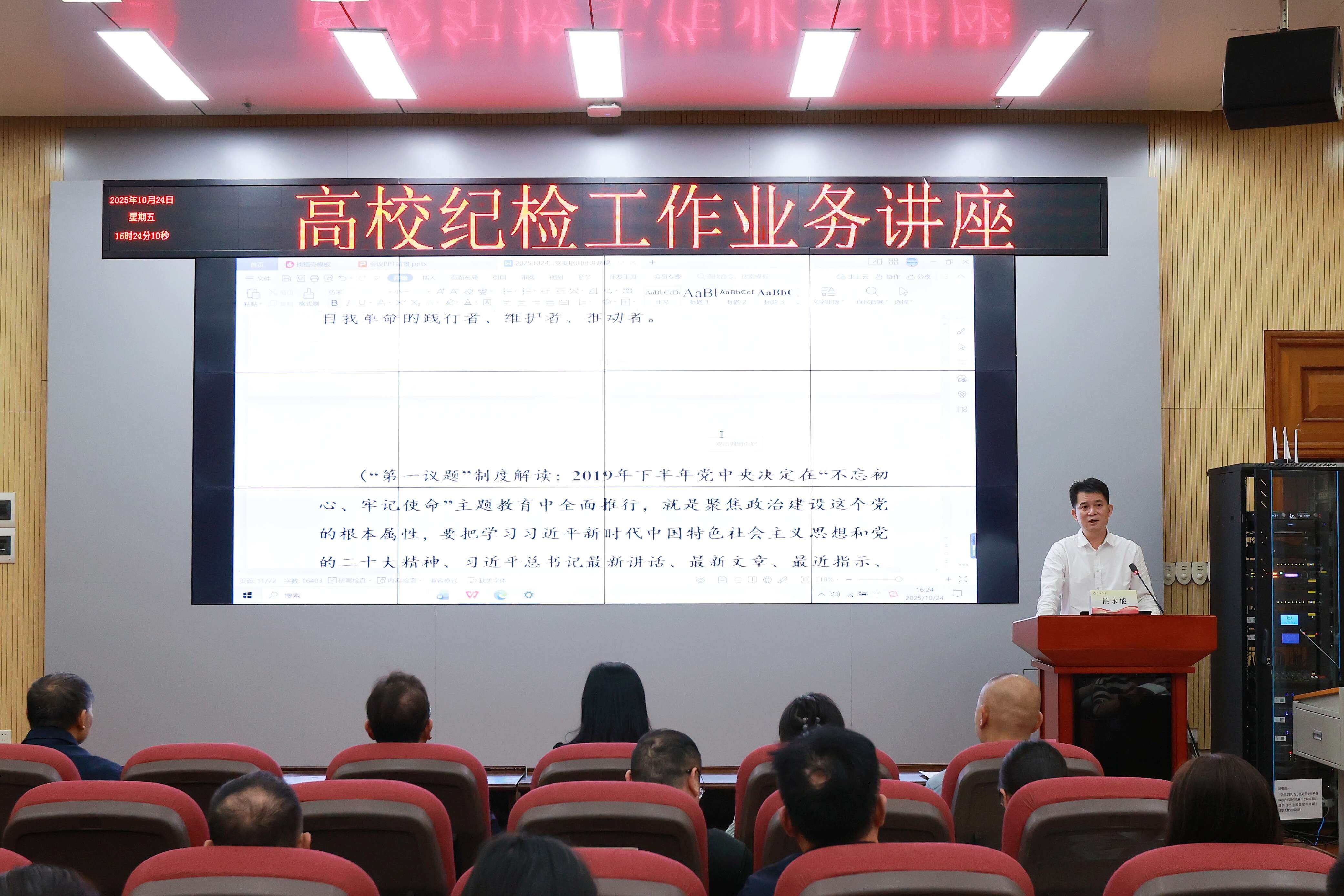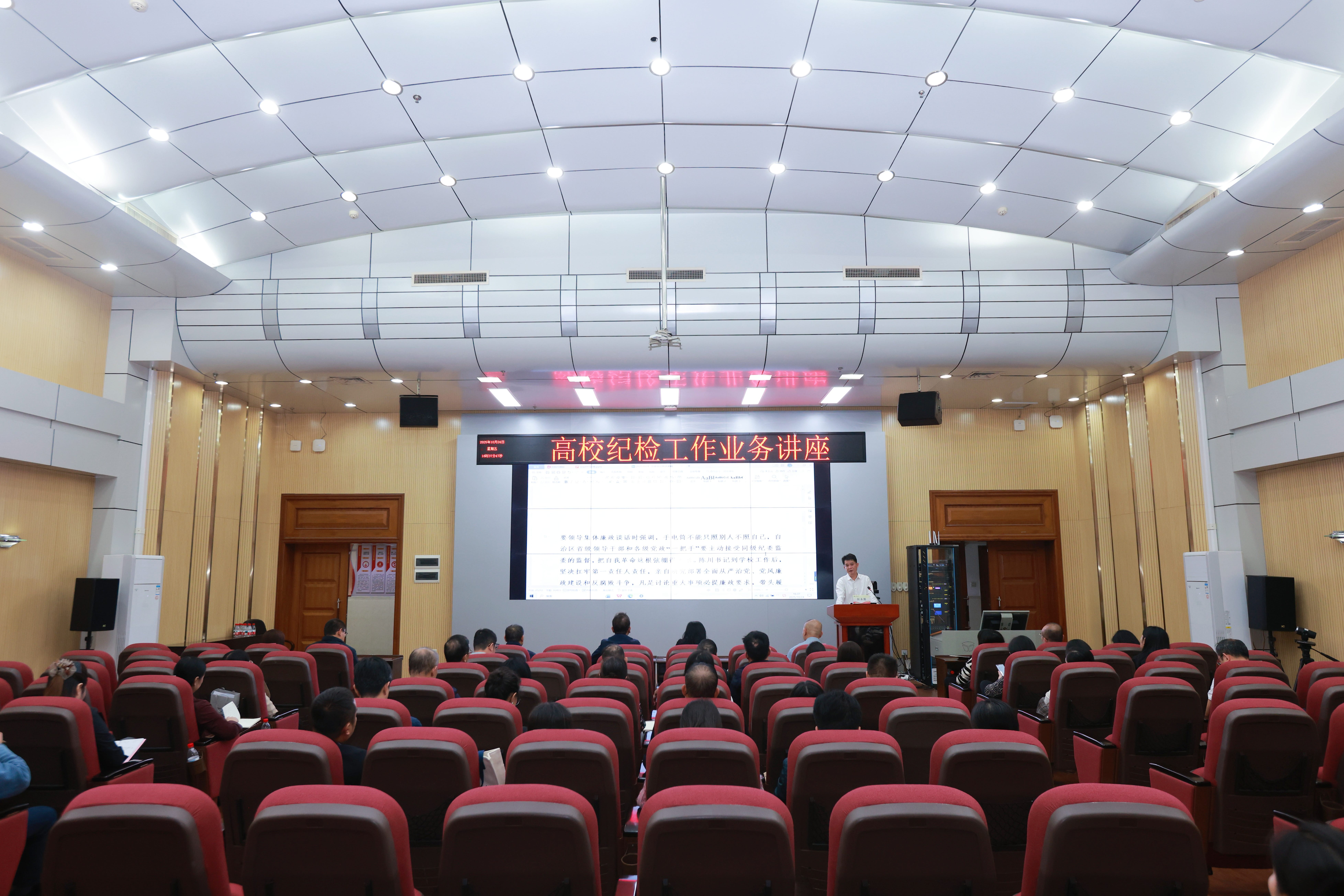 2025年10月24日下午,直属机关党委在综合楼九楼报告厅举办高校纪检工作业务专题讲座。驻校纪检监察组副组长侯永能应邀主讲。直属机关党委委员、纪委委员,机关各党支部书记、纪检委员等关键岗位人员,以及非独立法人单位纪检机构第一协作组8家单位的纪委书记,共计80余人参加培训。
